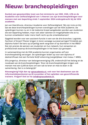 We hebben veel te vertellen, niet in de laatste plaats vanwege het feit dat de VGN academie een nieuwe tak erbij heeft: de brancheopleidingen voor studenten met een beperking. Je leest er meer over in deze extra dikke uitgave van onze nieuwsbrief. Daarnaast vind je informatie over ontwikkelplannen, regiobijeenkomsten, de opleiding tot trainer brancheopleidingen, aankomende leertrajecten en nog veel meer. En we zijn op zoek naar professionals die samen met ons willen bouwen aan nieuwe leertrajecten. Lees er alles over in deze nieuwsbrief