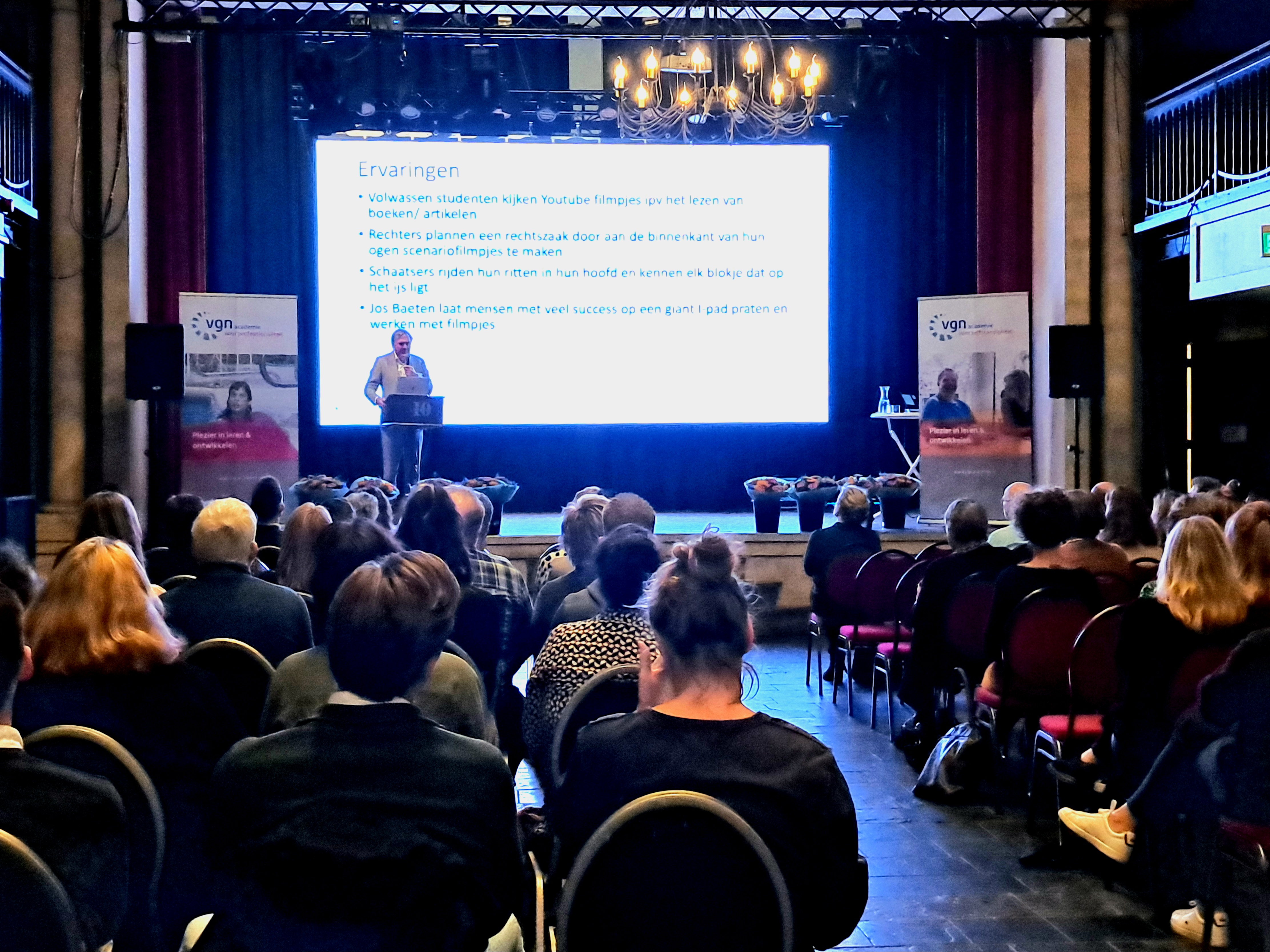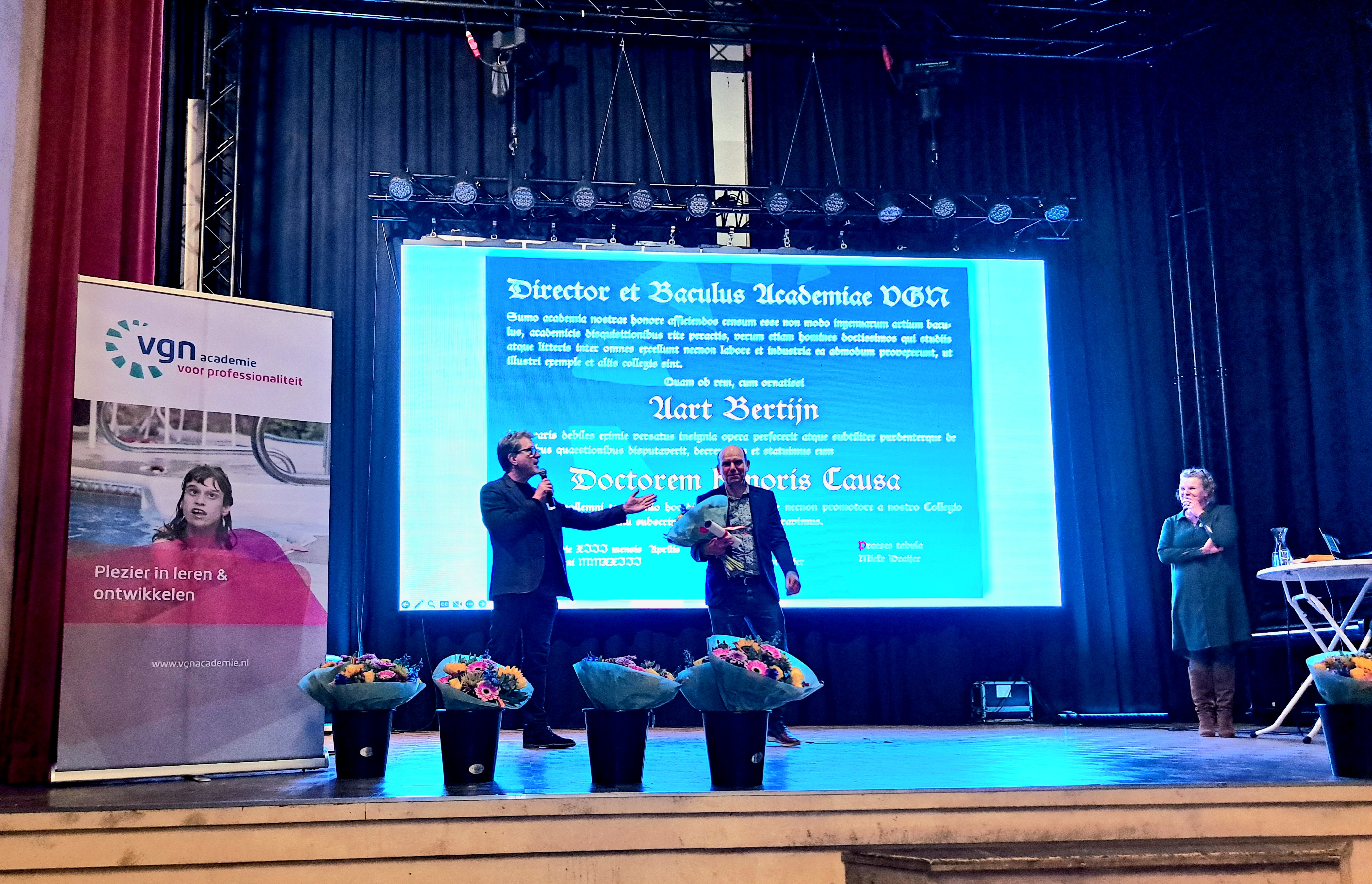 Donderdag 13 april kwamen maar liefst zo'n 100 mensen bijeen voor de jaarlijkse deelnemersdag van de VGN academie. Naast een inspirerende voordracht van prof.dr. Robert-Jan Simons over beeldend leren, waren er verschillende workshops onder leiding van Petrouschka Wind-Werker (over vertrouwen in vakmanschap) en Minie Eising en Ramon de Groot (van diploma- naar skillsgericht) en werd er uiteraard veel genetwerkt! Daarnaast nam bestuurder vanaf het prille begin Aart Bertijn afscheid. Hij werd toegesproken door directeur Paul Westmeijer en ontving uit handen van bestuursvoorzitter Mieke Draijer het allereerste 'eredoctoraat' vanwege zijn grote verdiensten voor de VGN academie.