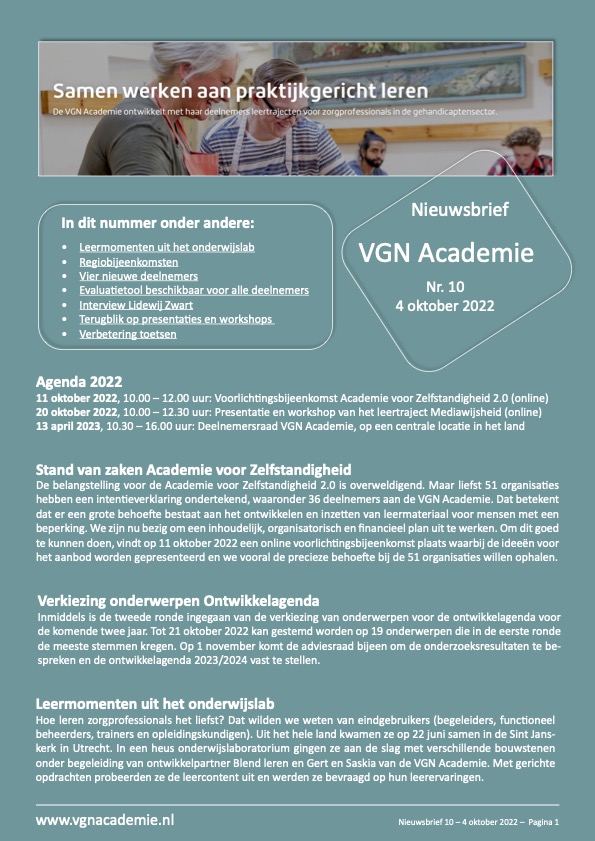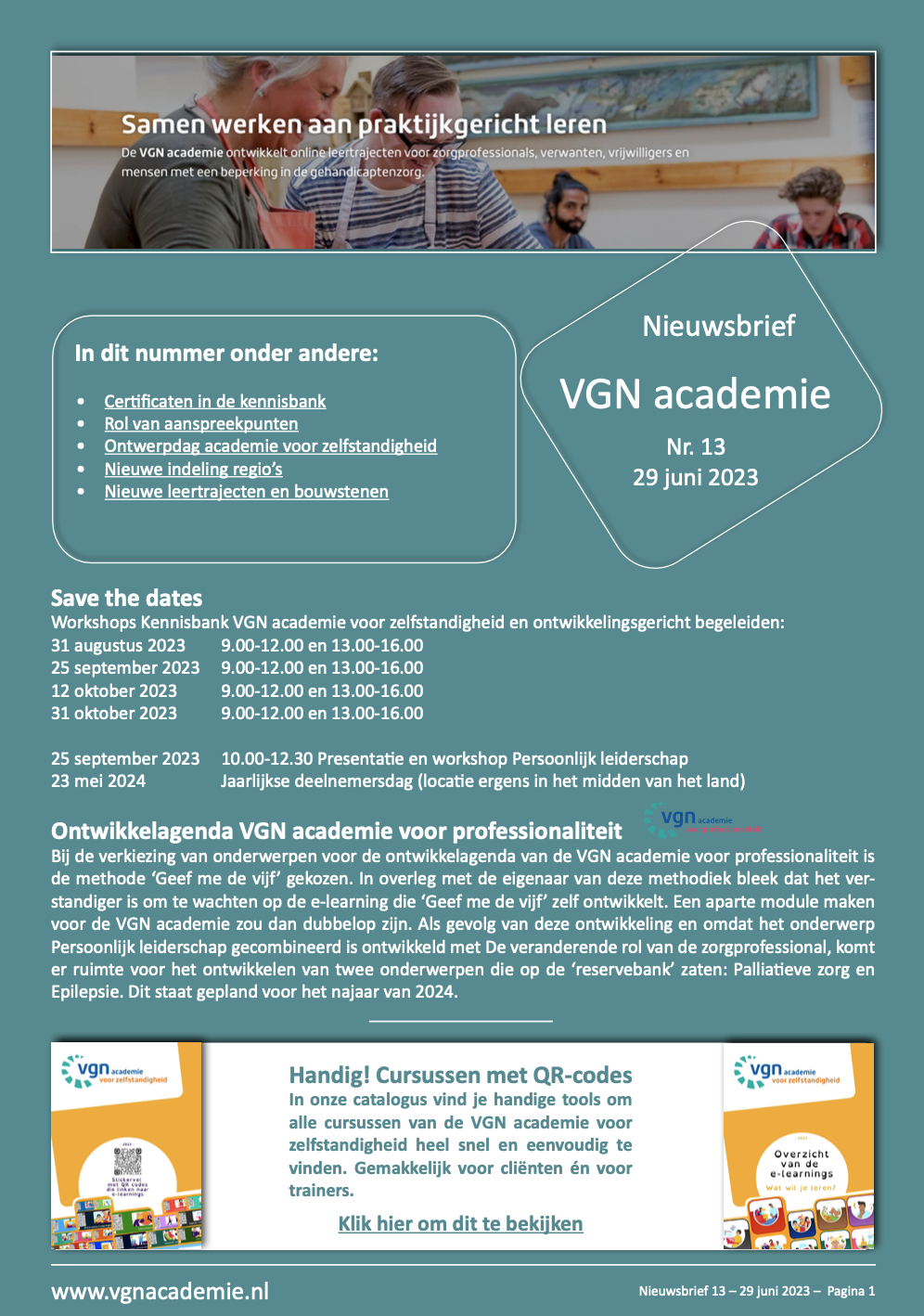 Dit is het eerste nummer waarin zowel informatie voor de VGN academie voor professionaliteit als die voor zelfstandigheid is opgenomen. In dit nummer o.a.: