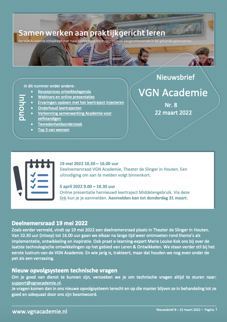 Het bestuur wenst Paul en het team van de VGN academie veel succes en samen met alle deelnemende organisaties bouwen we verder aan praktisch toepasbare online leertrajecten voor zorgprofessionals, mensen met een beperking, verwanten en vrijwilligers in de gehandicaptensector.
